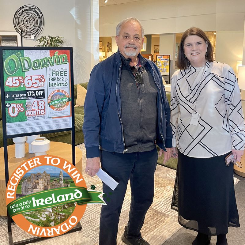 No doubt Fred Lovingfoss had the luck of the Irish on his side when he put in his name as part of the O-Darvin Sale 'Win A Trip To Ireland' promotion. The Mokena resident's name was pulled from hundreds of entries in the Darvin Furniture & Mattress showroom. Fred was excited to accept the prize for himself and a guest to travel to the Emerald Isle, compliments of Chicagoland's largest furniture and mattress store. Sláinte!