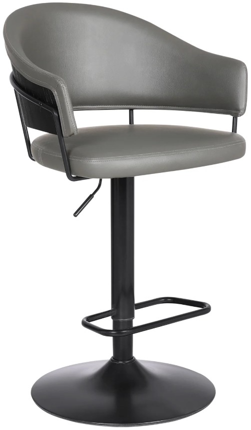 The rounded back and seat are cushioned with high-density foam and wrapped in beautiful grey faux leather upholstery. The opening between the seat and back allows for breathable easy seating and the metal accent brings the mixed materials together in harmony. The Brody adds convenience to your life with the adjustable seat height, full 360-degree swivel, and footrest. The swivel motion gives full mobility and you re able to easily engage with your friends and family regardless of their place in the room! The pedestal stool base keeps you firmly planted in one place while the faux leather upholstery makes cleanup a breeze! This kitchen stool is functional, stylish, and comes with a black metal base and accents as well as a black brushed wood back and grey faux leather upholstery.