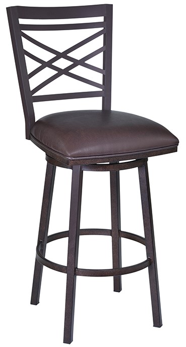 The unique cross-pattern back style of Fargo Bar Stool is unique to the Fargo, making it a standout item sure to turn heads at your next gathering. this elegant barstool also features a footrest for added comfort and stability. The Fargo's metal frame is Auburn Bay finished while the seat is upholstered with brown faux leather. The Fargo is available in 26 inch counter and 30 inch bar height. Excellent choice for a contemporary dining setting.