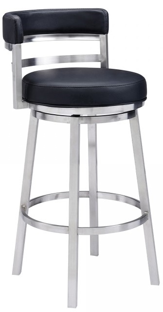 The Madrid’s durable brushed stainless steel frame is accompanied beautifully by its black faux leather seat and back. The upholstered low back is rounded, providing the user with exceptional support while the 360 degree swivel seat allows for enhanced mobility. The Madrid’s contemporary straight leg design endows the barstool with a chic quality that is further accented by the inclusion of a round footrest. The Madrid’s legs are tipped with floor protectors, assuring that the barstool will not slip on or scratch hardwood or tile floors.