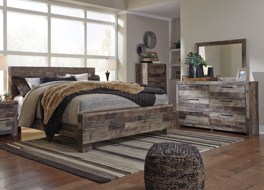 Modern yet hefty. This king panel bed makes an urban eclectic statement. Seasoned raw wood look merges with the clean lined design we love today. Muted rustic finish over replicated pine grain maintains its authenticity for a beauteous look.