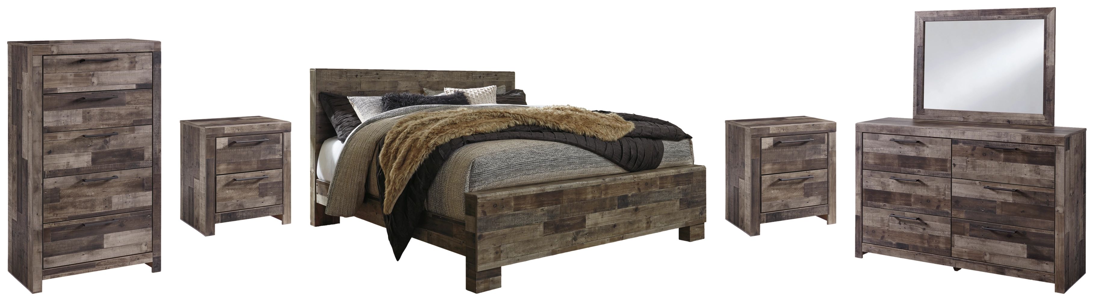 Includes panel bed (headboard, footboard, and rails), 6-drawer dresser with mirror, 5-drawer chest and two 2-drawer nightstands