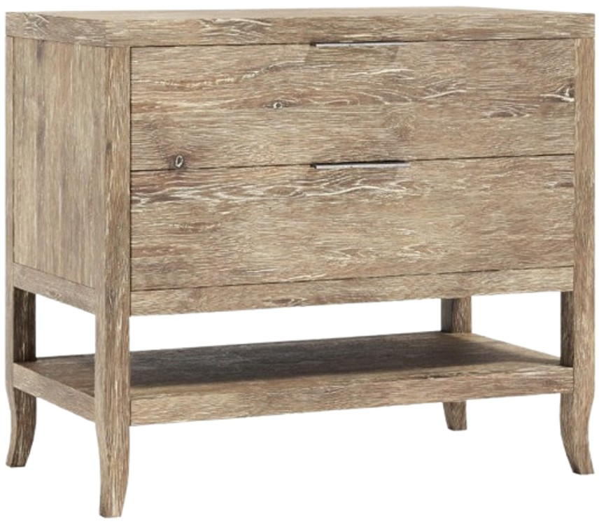 Two soft-close drawers with steel tab pulls in barlow finish and open shelf beneath
