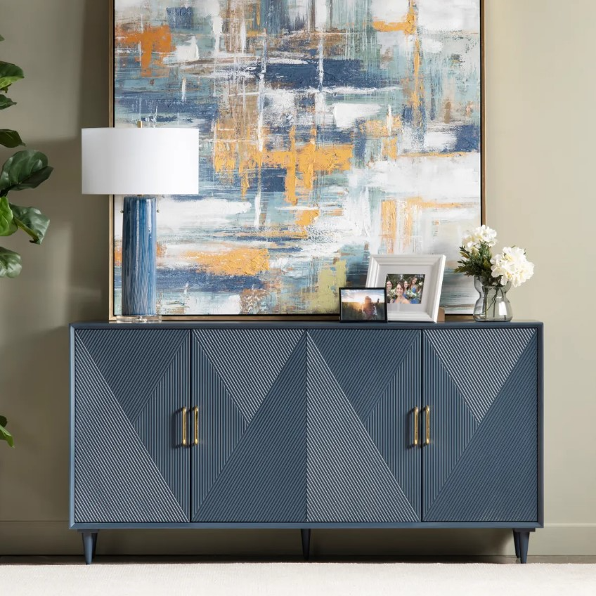 Store your dining accompaniments or entertainment accessories in this Crestview Collection Arvada 4-door Sideboard. The bold blue acacia wood finish and contrasting gold cabinet door pulls bridge the style gap in any home's space.Read More