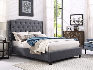 Add comfort and style to this king-size bed in your bedroom. It features a nailhead trim button-tufted headboard and a light fabric upholstery. The versatile appearance complements any palette of transitional bedrooms.Read More