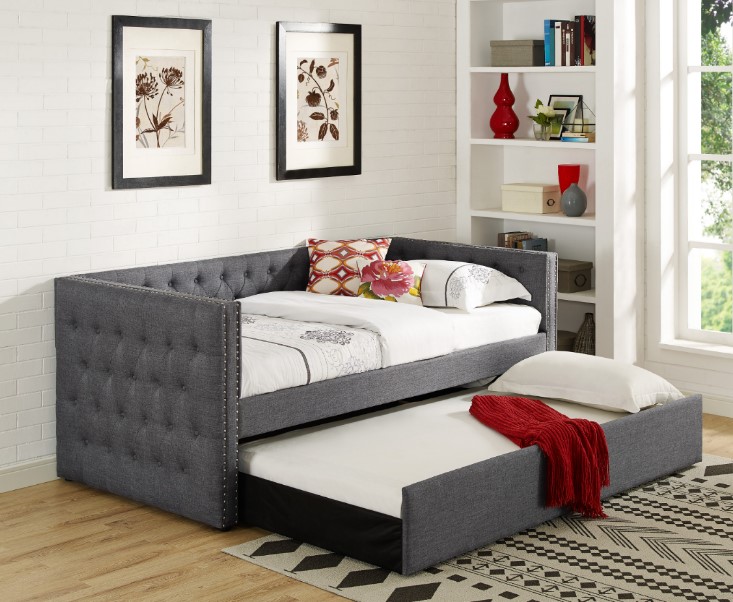 Create an inspired, dreamy retreat with Trina Daybed. It features sides and back tufted button with a double row of nailhead trim for a chic look. This daybed offers a relaxing, comfortable sensation in your room with a beautiful grey upholstery.Read More