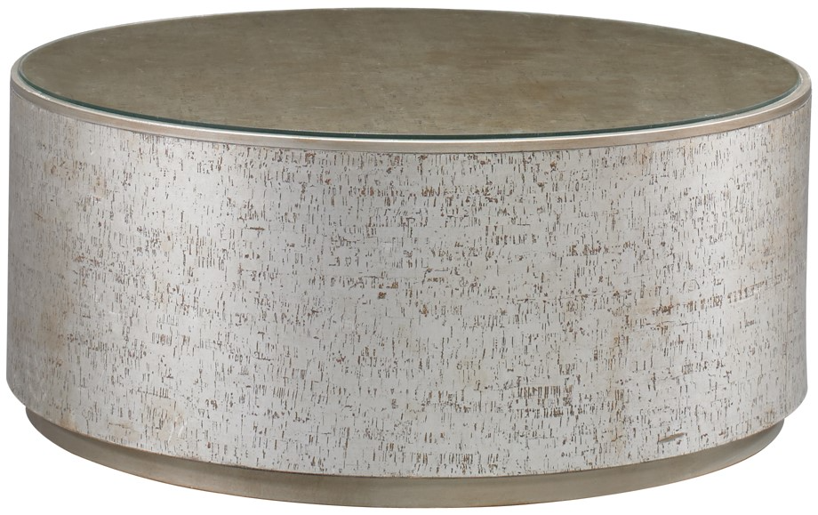 Large round drum table that is completely surfaced in cork with a handsome metallic bronze finish. The top is metal edge banded in a champagne gold finish matching the metal base. A clear glass top is added to help protect the cork top surface.Read More