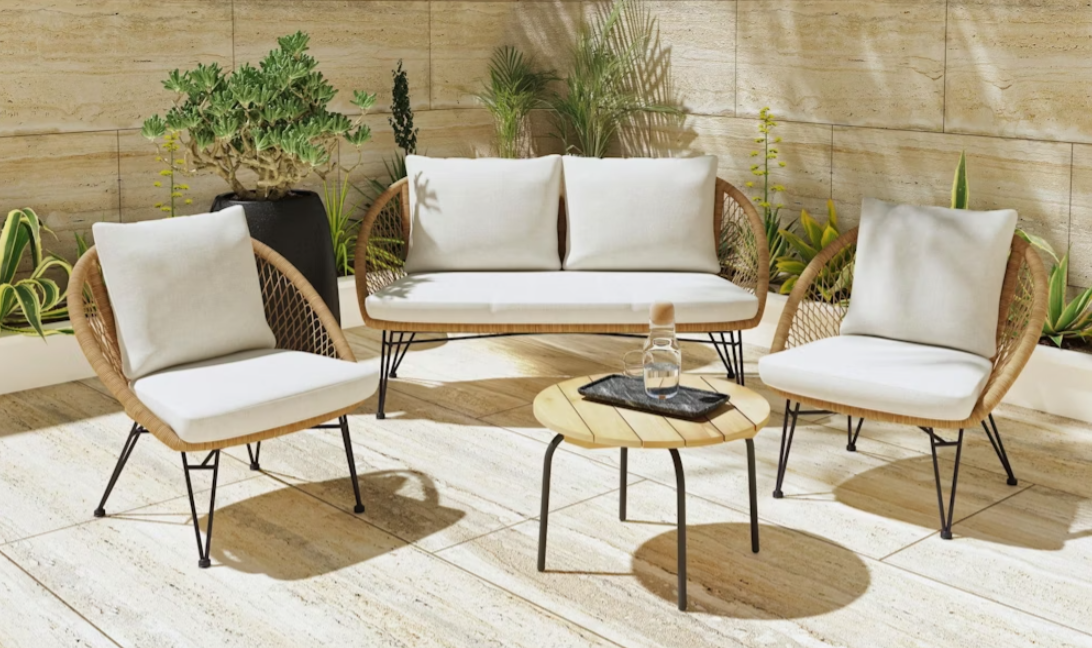 The Grace outdoor seating 4-piece set is crafted with a powder coated steel frame optimal for outdoor use and weather-resistant olefin upholstery. The table top is made with durable acacia wood ensuring longevity, while the understated metal legs.Read More