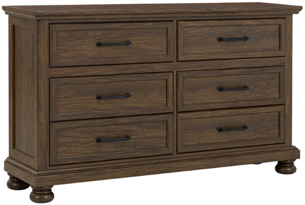 This brown finish dresser features six spacious drawers, offering stylish and functional bedroom storage with a light distressed look that adds timeless charm and practical organization to your space.Read More