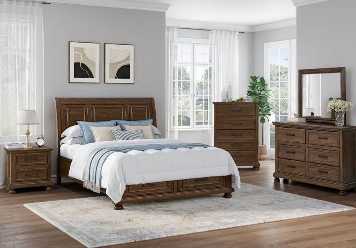 The sleigh headboard offers a graceful silhouette while the footboard includes two spacious storage drawers for practical everyday use