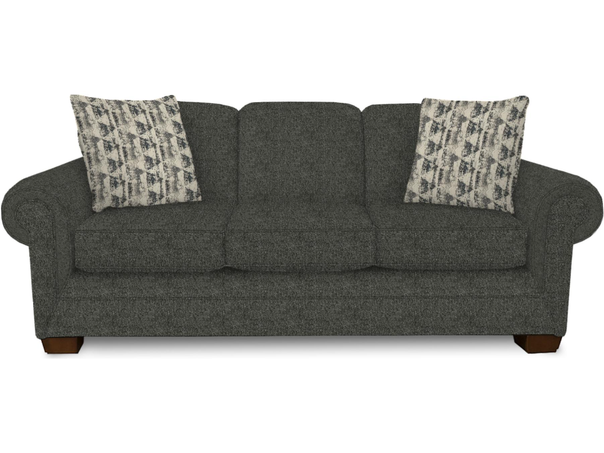 This sofa combines classic comfort and lasting quality. In 100% polyester tide granite fabric, it features rolled arms, attached back cushions, and ventilated, reversible block foam seat cushions with poly fiber wrap. Sinuous wire construction ensures supportive seating, while 20" poly-fill toss pillows in Voyager Steel add a stylish accent.Read More