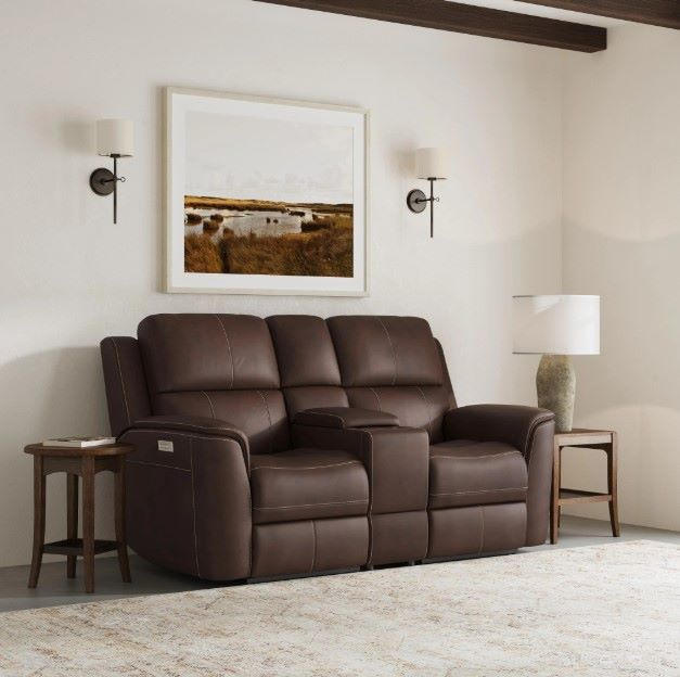 Treat yourself to a comfortable yet refined sitting experience with the Henry leather power reclining loveseat with console and power headrests and lumbar. This generously scaled frame is upholstered in a burnt umber brown leather, and features contoured seats and padded arms with a unique sculptural shape and welt trim.Read More