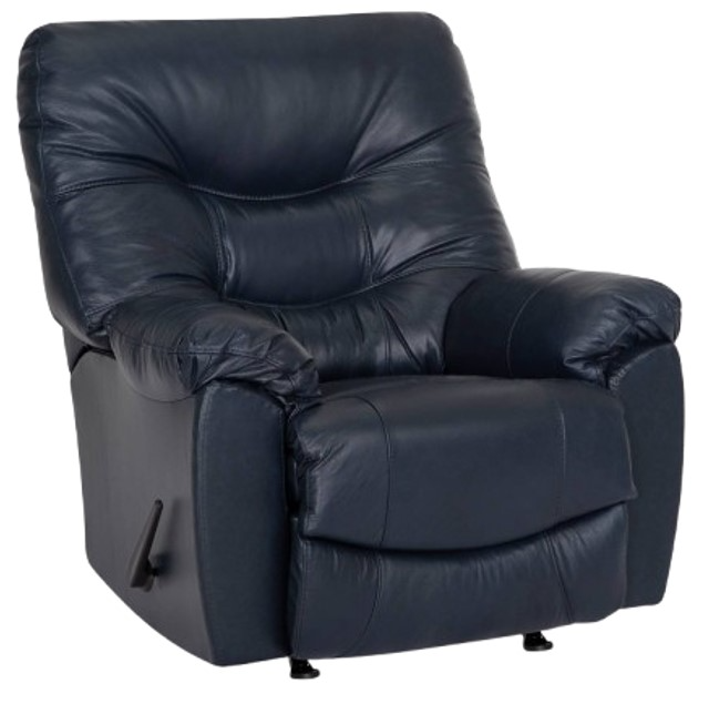 This manual rocker recliner features a rich federica navy leather-vinyl cover with a clean code of W for easy maintenance. Its generous frame provides supportive comfort with WOW gel-infused cushions wrapped in poly and a fiber-filled back.Read More
