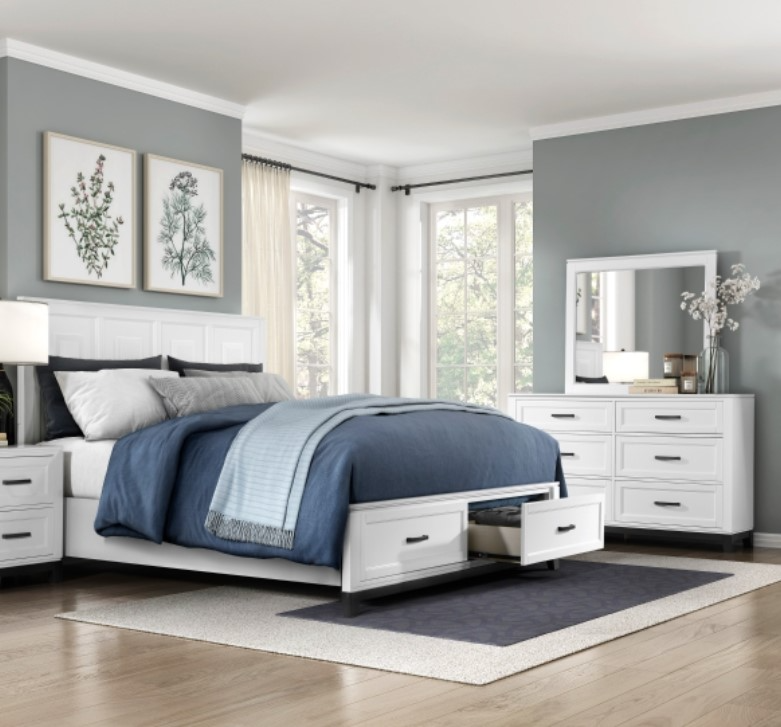 Elevate your bedroom with this elegant white-finished set, crafted from Acacia solids and Okume veneers. Featuring a spacious bed with footboard storage drawers, a 6-drawer dresser, and a wood-framed mirror, this set combines durability with modern charm. Ball-bearing glides and silver hardware add function and a touch of sophistication.Read More