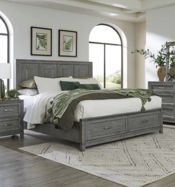The Garretson Collection blends transitional lines with rustic styling to create an elegant addition for your bedroom. The distinct grain of the okume veneer features a gray finish. The eastern king bed features metal bar hardware on the picture frame drawer fronts of the low-profile storage footboard.Read More