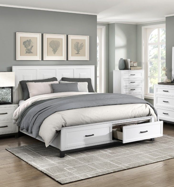 The Garretson Collection blends transitional lines with rustic styling to create an elegant addition for your bedroom. The distinct grain features a 2-tone finish. The California King bed features metal bar hardware on the picture frame drawer fronts of the low-profile storage footboard.Read More