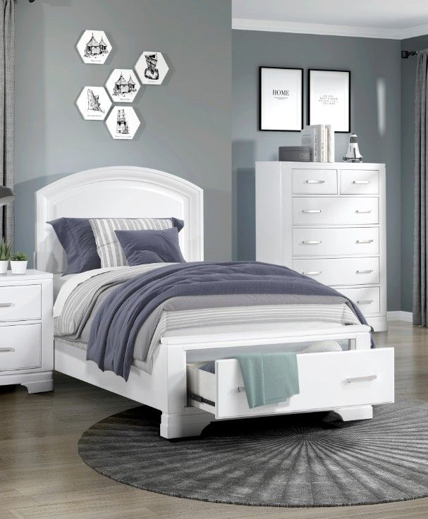 The intersection of modern lines and understated transitional style blend to create the Hudson Collection.The white finish over of the twin bed presents a decoratively versatile addition to your bedroom. Polished chrome bar hardware fronts the storage drawer of the bed’s footboard.Read More