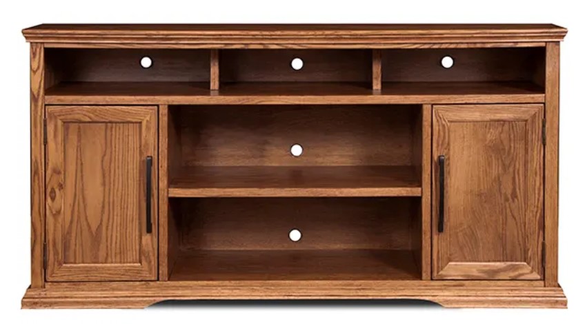 This Colonial Place 62" Console boasts an American styled group with all of the understated charm and appeal of rich, traditional furniture. It holds up to a 70" TV and is finely crafted in Oak with the classic golden Oak finish with antique bronzed hardware. It has a sound bar shelf and plenty of room to show off your media gear and collectibles, while having enough storage for games, music and movies .