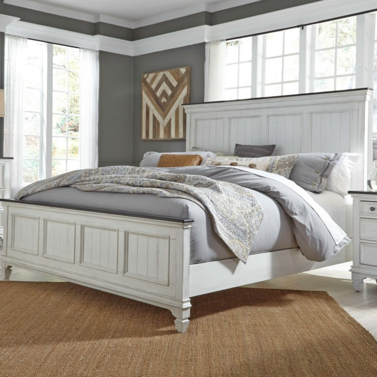 Create a classic look with a casual feel using the Allyson Park panel bed. The two-toned wire brushed white finish with charcoal tops creates a cottage style that works anywhere from the beach to the mountains. Crafted with pine solids and veneers with cathedral white oak tops.Read More