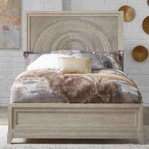 Make a statement with the Belmar panel bed. Crafted with rubberwood solids and split heart oak veneers, the washed taupe and silver champagne finish is accented by dusty gray wax that creates a unique look from piece to piece.Read More