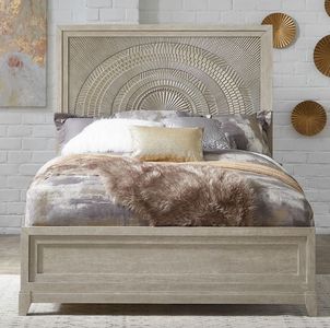 Make a statement with the Belmar panel bed. Crafted with rubberwood solids and split heart oak veneers, the washed taupe and silver champagne finish is accented by dusty gray wax that creates a unique look from piece to piece.Read More
