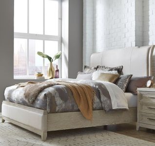 Invite this luxurious Belmar upholstered bed into your bedroom. Crafted with rubberwood solids and split heart oak veneers, the washed taupe and silver champagne finish is accented by dusty gray wax that creates a unique look from piece to piece.Read More