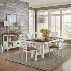 Feel at home with the Brook Bay five-piece trestle table set. Crafted with excellence using rubberwood solids and mindy veneers, this set features a two-tone Carbon Gray and Textured White finish and consists of the trestle table and four upholstered ladder back side chairs.Read More