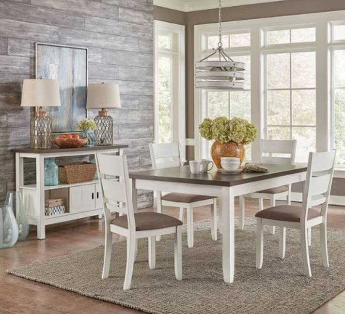 Feel at home with the Brook Bay optional five-piece leg table set. Crafted with excellence using rubberwood solids and mindy veneers, this set features a two-tone Carbon Gray and Textured White finish and consists of the leg table and four upholstered slat back side chairs.Read More