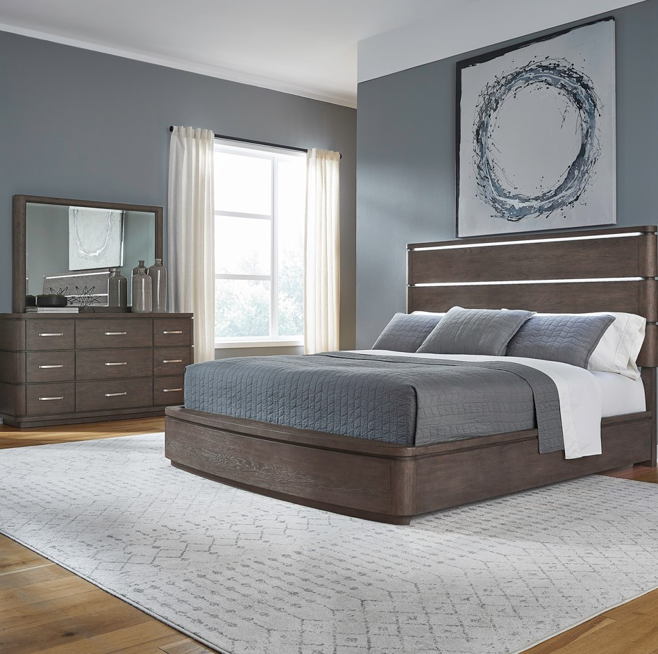 Modern elegance meets smart functionality in the Cascade Falls bedroom set. Finished in rich satin espresso, this set features a stunning LED-lit headboard, bow-shaped footboard, and a spacious 9-drawer dresser with soft-close glides. The starburst veneer pattern and beveled glass mirror complete the sleek, upscale look.Read More