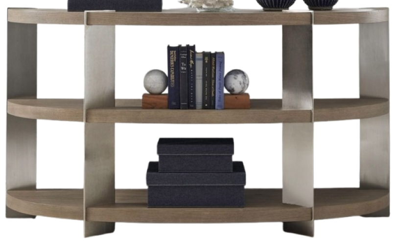 The demilune shaping adds a touch of grace, creating a silhouette that is both classic and contemporary. Adding to its functionality, the Harlow sofa table features two bottom shelves, offering ample storage space for organizing your living room essentials. Whether it's books, decorative items, or everyday necessities, this table ensures your space stays organized without compromising on style. Sleek metal legs in a Satin Nickel finish elevate the table's overall design, adding a modern and luxurious touch. The combination of wood and metal creates a harmonious contrast, making the Harlow sofa table a versatile piece that complements various interior styles. Elevate your home with the perfect combination of style and functionality with the Harlow sofa table.