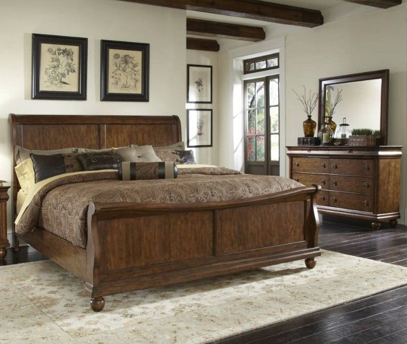 This sleigh bed features a headboard that rolls back and a footboard with a rolled cap rail that scoops in the middle, adding for nice motion. The dresser has eight drawers and can accommodate the landscape mirror with a beveled edge with the included bolt-on supports.