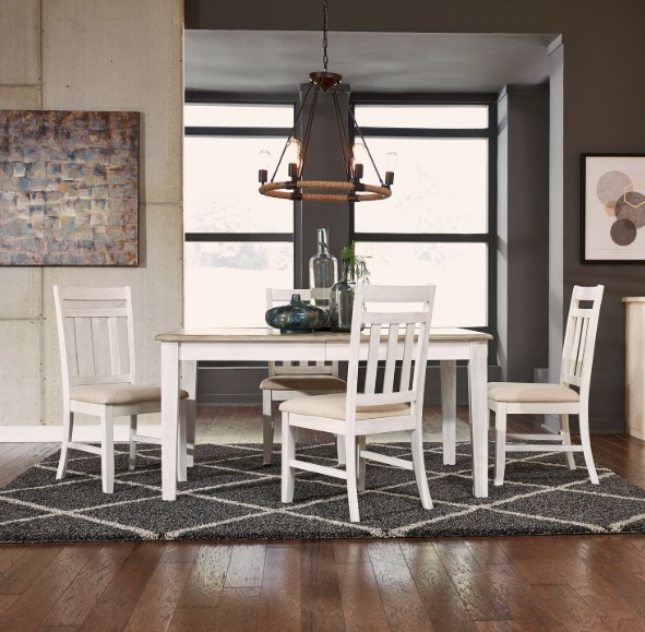 The table includes an 18” removable leaf to accommodate guests or a larger family. The chairs have a padded upholstered seat in cream linen and feature tapered legs with nylon chair glides to protect your flooring. Summerville features the best of cottage design with a casual two-tone finish that works well with any interior.