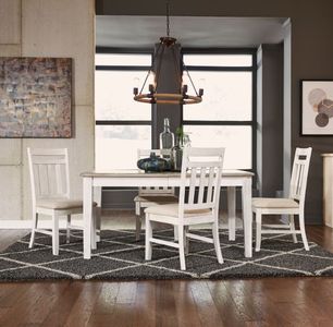 Sitting pretty with the Summerville five-piece rectangular table set. Crafted of rubberwood solids with pine veneers, this set features soft whitewash bases with a wire brushed gray top and consists of the leg table and four splat back side chairs.Read More