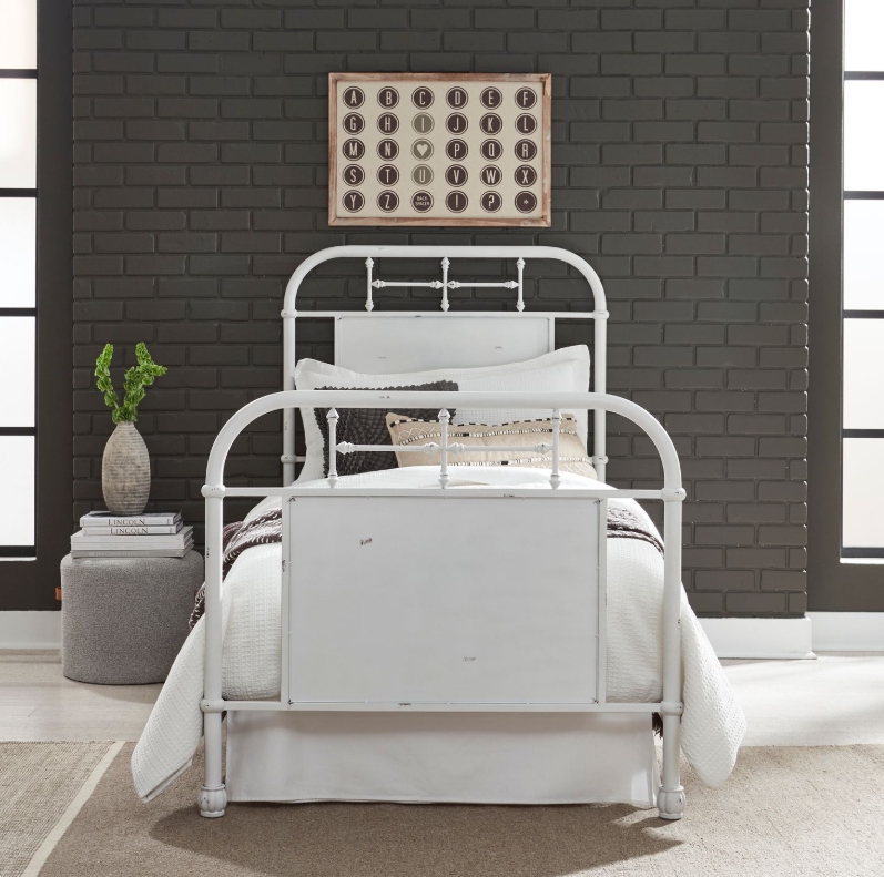 Add a unique look to your home with the Vintage Series Twin Metal Bed. Crafted of metal tube and finished in a beautiful antique white with wear thru. The headboard and footboard feature a softly shaped cap rail and turned metal spindles highlighting a center panel.Read More