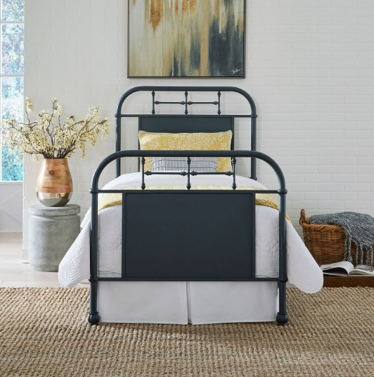 Add a unique look to your home with the Vintage Series twin metal bed. Crafted of metal tube and finished in a beautiful navy with wear thru. The headboard and footboard feature a softly shaped cap rail and turned metal spindles highlighting a center panel.Read More