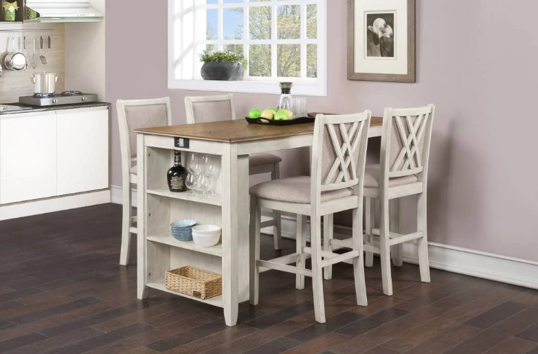 The counter height 60" dining table has a handy storage shelf for kitchenware and collectables