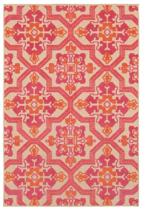 Vibrant shades of tangerine, lime, Mediterranean blue, cherry red, charcoal and bright strawberry pink pop on the natural sand colored background in crisp geometric and global inspired patterns.