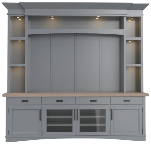Surround your television and components in classic style with this 92-inch TV console with hutch and back panel. Simple yet elegant, its classic silhouette is finished in a dove gray with a contrasting wood-grain top in weathered natural.Read More