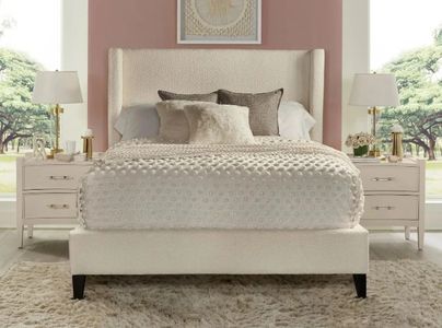 Tailored to perfection, the stately Angel bed creates a signature design aesthetic. Its tall, slightly winged headboard creates the perfect backdrop for reading or watching a favorite show, while its classic silhouette enhances the beauty of any bedroom. Upholstered in a soft, textural bouclé fabric.Read More