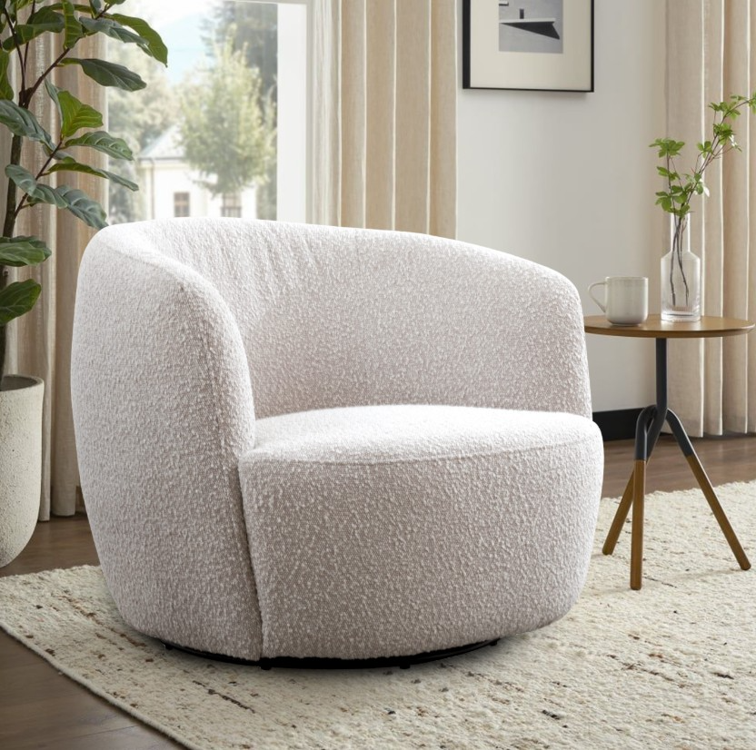 This swiveling accent chair updates your living room with a playful, modern look. It's made with a kiln-dried solid pine wood frame with a streamlined barrel silhouette. The design features a curved back with foam padding and a seat bolstered with sinuous springs, wrapped in polyester fabric in a neutral hue.Read More