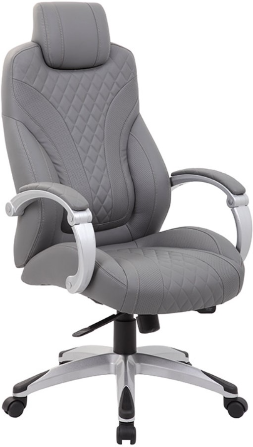 This hinged arm executive chair is beautifully upholstered in grey Caressoftplus Vinyl for the kind of comfort and durability required for a long day at the office. It features a designer stitched back cushion and pivoting hinge arms that allow the seat and back to move independently in tandem.Read More