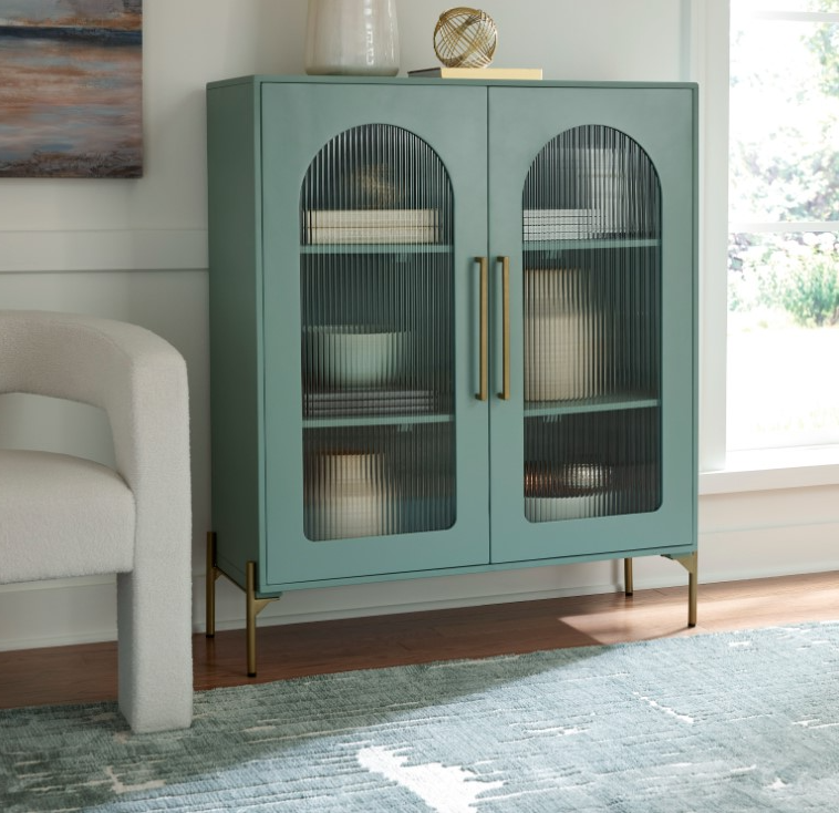 Clearly a stunning statement piece for lovers of contemporary design, this sleek accent cabinet wows on many levels. Magnificent arched fluted glass door panels and gold-tone metal hardware exude serious modern flair. And how about that fresh green finish? Two shelves add practicality to the cabinet's striking style.Read More