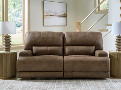 Expansive and elegant, this power reclining sofa makes a sizable style statement. Its large scale enhances the luxe look and magnifies the beauty of faux leather in an earth tone, punctuated with jumbo stitching. One-touch power adjustable headrests mean infinite ways to recline in stylish comfort. USB charging completes the experience.Read More