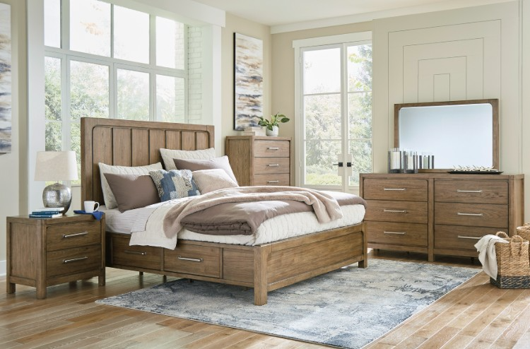 This king panel bed with storage sits comfortably at the intersection of modern lodge and farmhouse aesthetics. Your warm and welcoming disposition is reflected in its charming architectural elements and light brown glazed finish. Storage drawers are effective space-savers, defining your bedroom with reliable function and style.Read More