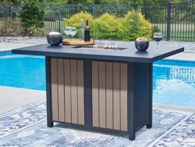 Easy-breezy beauty, made to withstand the elements. This outdoor bar table with fire pit makes a serene statement with its soothing shade of blue and contrasting wood-look cabinets. An integrated fire pit in the top adds a perfectly cozy vibe.Read More