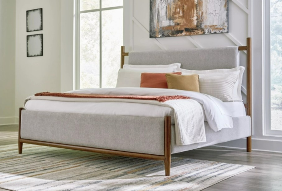 Includes upholstered panel headboard and footboard