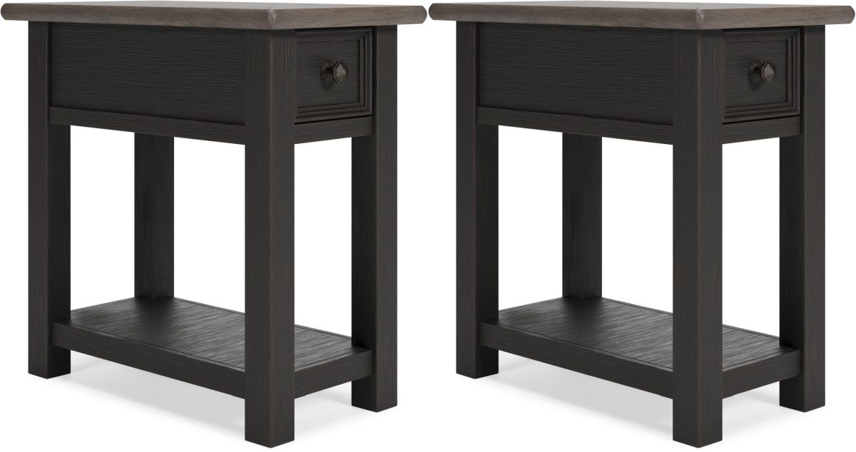 Quality crafted and richly styled, this rectangular chairside end table set is sure to charm. Its two-tone aesthetic pairs a weathered grayish brown tabletop with a textured wire-brushed base in black with rub-through effect. The built-in shelf offers handy display space, while an integrated 110V power supply with dual USB charging ports makes it so easy to keep your personal devices powered up.Read More