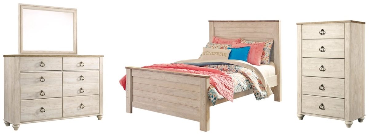 Includes full panel bed (headboard, footboard, rails), dresser with mirror and chest of drawers