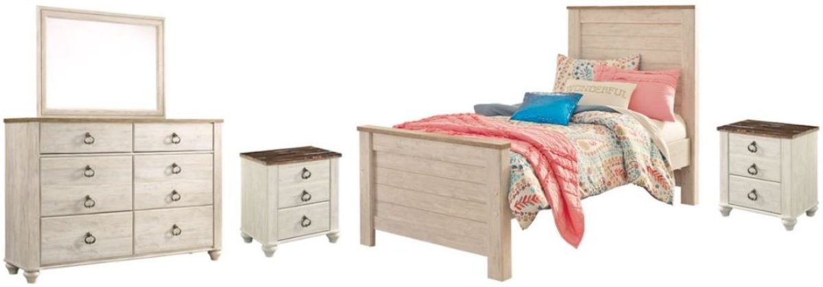Includes twin panel bed (headboard, footboard, rails), 6-drawer dresser with mirror and two 2-drawer nightstands