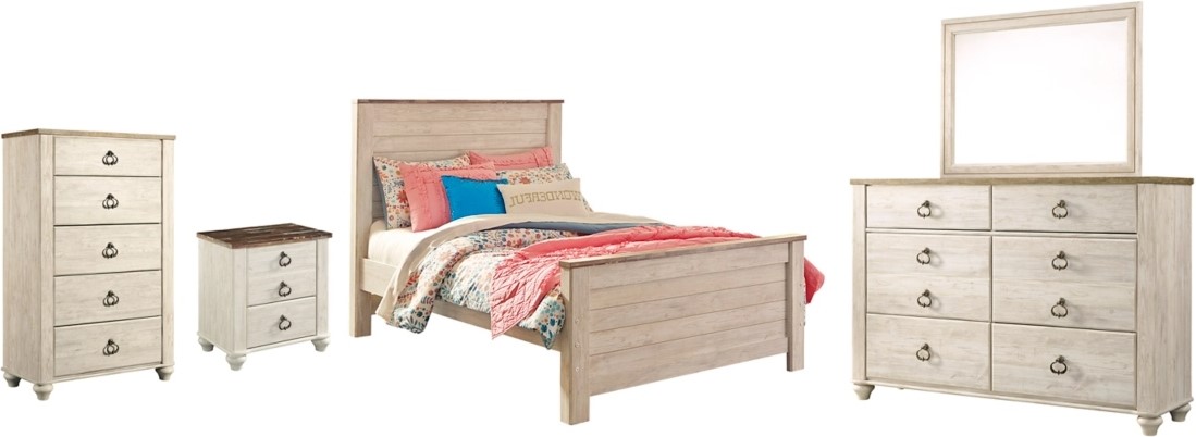 Includes twin panel bed (headboard, footboard, rails), 6-drawer dresser with mirror, 5-drawer chest, and 2-drawer nightstand